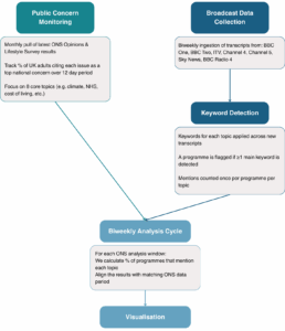 Our analysis prioritises UK PSBs because they are required to serve the public interest and reach large, diverse audiences. We also include Sky News, a widely consumed commercial channel with a strong presence in traditional broadcast news. As many news organisations increasingly focus on emerging digital platforms, the Climate News Tracker ensures that traditional audiences, who still rely on TV and radio and number in the millions, are not left behind. By focusing on these established channels, we assess how well legacy news outlets reflect public concern on major national issues. Our approach compares the frequency of issue mentions in news programmes to levels of public concern as measured by the Office for National Statistics (ONS) Opinions and Lifestyle Survey, a 12-day national survey.